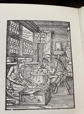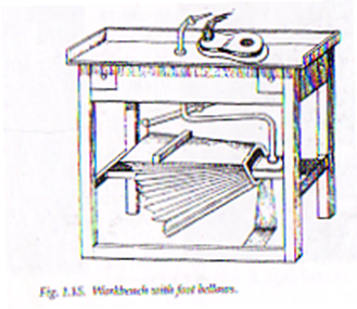 Soft glass is what was used in the 15th century. Glass rods were bought by the bead maker during that time (Jargstorf, 32). The glass of the 15th century was softer which means it had more silica vs. lime (Hoyt, 11). Lampworkers from the 16th century worked over an oil lamp and used a bellows system to infuse oxygen into the flame making it hot enough to melt the glass (see picture). workbench