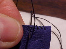 To sew the glove pieces together, I used waxed, 100% white silk thread. To apply the wax, I pulled the thread over a block of beeswax. The wax gives the silk holding power in the leather, keeping the stitches tight as you add a new stitch. It also strengthens the hold and preserves the fibers.