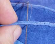 A glover’s needle, which has a three-sided head, slips through leather like a hot knife through butter. These needles are great for medium and heavy weight leathers like buck, elk, and some doe. You can also use simple ‘sharps’ to sew the finer leather. I use a ‘sharp’ needle, size 9 on the finer doe and kidskin. The key is to be able to stab and draw the waxed thread easily through the leather. Whichever needle serves this purpose is the one I use. I recommend testing on a scrap piece of leather prior to using it on the final product. I strive for stitches evenly lined along the seam as is illustrated on the extant surviving pieces. I used a size 5 glovers’ needle on this pair of gloves. It was small enough to effectively pull the waxed, silk thread through the leather without damaging the leather. It is important to use a metal thimble to protect your fingers as you draw it back and forth. Text Box: Ilustration from the Book of Trades 1568, The Needlemaker Workshop