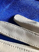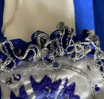 The lace on the cuff of these Elizabethan gloves was sewed to the edge after the embroidery on the white satin was complete. I took an equal amount of blue satin to back the embroidery design and line the inside of the cuff, then used buckram inside to stiffen, then sewed the cuff to the leather portion of the glove with a 1/8” seam. I used a prix stitch, and you can see the seam on the inside of the glove. I normally would cover the seam with ribbon, but wanted to leave the seam since it did not cause any uncomfortableness when sliding my hand inside.