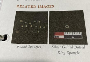 Spangles, also called Oes or Owes, are a small, usually round, piece of metal, much like today’s sequins (en.wikipedia.org/Wikipedia.org/wiki/Oes). They were used in embroidery, bobbin lace and other textiles to draw attention to the decorated item (historicjamestowne.org/collections/artifacts/spangles).