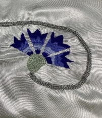 I chose a cornflower for my floral design because it has spiky edges that look cool. It was one of the floral designs commonly used in Elizabethan embroidery (see top picture). This was from a 17th century embroidered panel. I also liked the flower because it is blue, a heraldic color that represents my Kingdom of Atlantia. I used 100% silk floss on white satin. I backed the satin ground cloth with an embroidery stabilizer prior to applying the floss. The stabilizer helps with application of the stitches, so they are firm without bunching the material. The stitches for the petals of the cornflower are a ‘stem’ stitch, a stitch commonly used as an outline or filling stitch during this time (Staniland, 34). The green base bulb is done in a silk green chain stitch, which is a progression of loop stitches (Staniland, 35). The plaited stitch is done in the design using a modern silver cording but was done with a silver passing/filѐ thread (a core thread, usually of white silk, tightly wrapped with a thin flat strip of metal  s-twisted making the inner core barely visible) during Elizabethan time. This stitch is found on numerous garments and furnishings in the Elizabethan time (Carey). Plaited stitches are a stitch applied in a woven fashion to give the raised effect on the cloth. All these stitches were mentioned as used on items in Elizabeth’s wardrobe inventory. I sewed silver spangles, blue lampwork beads, crystal and metal beads in the design to enhance the depth