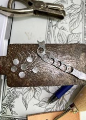 The silver spangles I sewed on the design of the Elizabethan glove on display were hand cut from a hammered piece of silver tin wire. Tin is identified as a metal used to make metal mounts, buckles and other small items found from excavations in the City of London undertaken by the Department of Urban Archaeology, Museum of London (Egan/Pritchard, vii). Based upon this, I used a tin wire to bang out flat, then I used a paper punch to punch the spangles out of the flattened wire. Each one is cut separately, and the center hole is punched with an awl. I made these spangles for the embroidery design only. They are different from the spangles in the bobbin lace (see bobbin lace). I sewed each spangle into the embroidery design with three silk threads as was done on the Layton Jacket from 1610 (Carey, 93).