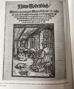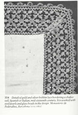 Bobbin lace, also known as bone lace and pillow lace, is found on many surviving garments from the 16th century located in museums throughout Europe. Some lace was known as bone lace because the earlier process consisted of using chicken or fish bones as pins and many times bobbins too. Bone lace was also believed to be made with a finer thread than bobbin lace (Wright, 8). Pillow lace is also a term used for bobbin lace because it was made on a pillow or bolster as shown in the wood engraving in the picture.
