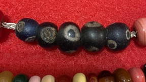 “Glass is made from sand (silica), soda and lime, potash, lead oxide, and cullet (left over glass). Metal oxides are used to impart color: cobalt oxide turns a melt deep blue; iron or chromium oxide turns it green; gold changes it to cranberry” (Hoyt, 8). Venice Italy became the glassmaking center of all Europe during the 14th Century. In 1500 Venetian glass workers created ’cristolo’, a glass as clear as crystal (Hoyt,7). Venice continued to produce glass items and as a matter of fact is still known for its glass products today throughout the world.A row of black beads