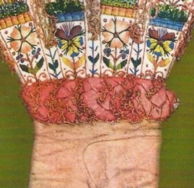 Silk threads in many colors decorated the garments and accessories of the 16th and 17th century. Floral designs were popular due to the insurgence of garden cultivation in the private home. Tudor pacification facilitated gardens as an important part of the home. Botany also became a special interest of the learned world (Rigby, 36). Books like Culpeper’s Complete Herbal by Nicholas Culpeper were being written. It stands to reason that as the populace became enamored with the plants and flowers in these botanical editions, they would incorporate them into the other aspects of common living, like embroidery. A floral pattern was very popular and ‘cosmopolitan’, originating in workshops of Paris or Antwerp on the mainland and overflowing into England. The costly part of the gloves was the embroidery (Digby, 79). The Catalogue of English Domestic Embroidery of the 16th and 17th century has a list and pictures of recorded gloves that show that white satin or ‘sateen’ (Arnold, 371) was often used as the ground for a floral embroidery design on a glove cuff. This inventory also defines the stitches used in embroidery designs made in Elizabethan time (Nevinson, 94-97).