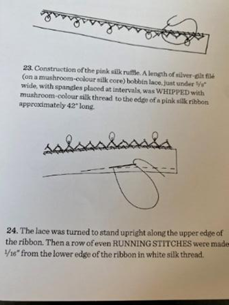 The ruched ribbon or ‘ribbon ruffle’ (Tiramani and North) is fashioned after a piece found on a pair of Henry VIII gloves in the picture to the right from W.B Redfern Royal & Historic Gloves and Shoes publication. It is made from a tabby woven pink silk ribbon just under 5/8” wide. The ruched ribbon on the Redfern glove measures 42” long. To create the ruffle effect, a row of running stitches was made 1/16” from the lower edge of the ribbon in white silk thread. The running stitches were gathered up to approximately 8 1/2” and then the ruffle was manipulated into a figure eight shape. A second row of stitching attaches the ruched ribbon to the body of the glove. The two ends are whipped stitched together for a continuous piece of ruched ribbon. As you can see in the illustration there is bobbin lace with spangles interspersed along the strand sewn on the edge of the silk ribbon (Tiramani, 152).