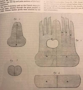 The Worshipful Company of Glovers was established in 1349 in England (and still functions today) and monitors the standards of gloving. All things to do with making a pair of gloves are documented and directed by this company in England. It was granted a Royal Charter in 1638 by King Charles I. Many other organized glover guilds are documented throughout Europe (France, Austria, Germany, Spain and Ireland) from 1190 onward (Ciba, 2212). Diderot’s Encyclopedie, published in 1764, records the patterns, tools and methods the early glover of the 16th/17th century used (Cummings, 13). The process of making gloves for royalty during the Elizabethan times was very problematical and usually resulted in adjustments afterwards (Collins, 52). Gloves are also recorded as being made on the large and loose side (Ellis, 18). On a surviving pair of leather gloves from the Victoria and Albert Museum in London England, there is what looks like an adjusting seam on the forchette of the index finger. From these sources we can determine that there was no standard pattern for gloves and that adjustments were made after the glove was finished.