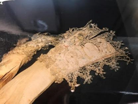 Bobbin Lace – Many extant gloves in museums have variations of bobbin lace sewn on the edge of cuffs to embellish. Pictures I took from the Victoria and Albert Museum (V&A museum) of gloves that have this lace are displayed in the documentation below. I demonstrated how I made the tools (bobbin lace pillow and hand carved my own bobbins) and included the spangles to make the bobbin lace a part of the gloves. There are two sets of bobbin lace; one set along the edge of the ruched ribbon, the other on the edge of the cuffs. I’ll explain both.