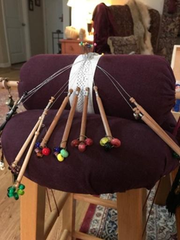 There is a description on how to make a bobbin lace pillow in Brigita Fuhrmann’s Bobbin Lace, an Illustrated Guide to Traditional and Contemporary Techniques. I used that as a guide but created my own final design suited to my purposes. To make this pillow, I started with a ¾ inch wooden dowel for the center. I attached one end of a strip of woolen blanket then wrapped the blanket around the dowel until the pillow was as thick as I wanted. I used a woolen blanket instead of sawdust and sand, to emulate the Elizabethan pillows that were stuffed with wool. I didn’t want to stuff it with sawdust or sand because if it ever ripped it would create a mess. The wool blanket allows the pins to enter and holds them firm. It also allows the pillow to be portable.  I used a linen napkin to cover the wool blanket. I gave the pillow handles on each side by sliding on wooden knobs on each end of the dowel.  When making lace and I’ve worked the pattern as far as it will allow and when it’s time to turn the pillow, I only pick the pillow up by these wooden knobs without disturbing the rest of the pillow.