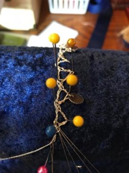 As described earlier in this documentation, bobbin lace is made by twisting and turning the bobbins that hold the thread, pinning at a designated time on the pricking, and twisting and turning for each segment until the lace is made. The bobbins hold the thread and are worked in pairs. The spangles (see section for Spangles) interspersed evenly along the edge of the lace, were grouped on one of the threaded bobbins and as the thread is twisted and turned to create the lace, a spangle is released and caught up in the twisting and turning, remains in the portion of the lace that is completed. The spangles used in this lace were bought because I did not have the time to make as many as I needed for the lace AND the embroidery. They are of the same material and design; metal disks with a small hole. I made 45 inches of lace for the ribbon for each glove.