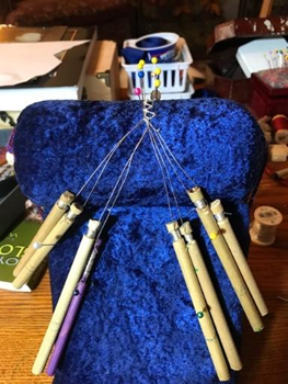 The bobbins were made of ivory, wood or bone and were hung in pairs around each pin shaft.  Some bobbins were nothing more than a twig. Others are finely carved and are weighed with glass beads at the bottom. The bobbins, whatever they were made of, had an indent carved in the top part to accommodate a length of thread that was wrapped around and held in place with a double slip knot. One strand of thread (linen, gold or silver) accommodated two bobbins. One end of the thread would wrap around one bobbin and the other end of the thread wrapped around the other bobbin in the pair. This pair of bobbins was hung over a pin in the pricking.  The hanging bobbins were placed on the pillow side by side as they hung over the pins. Creating the lace consisted of twisting and turning these bobbins and placing the pins in holes of the pattern according to the pricking as it was said earlier.