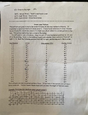 Bobbin lace is woven in many different patterns making up the delicious variety of lace seen attached to all the surviving pieces from the 16th century. The first known bobbin lace pattern book was published in 1591 (527, Palliser). The pattern for lace was created by poking holes in a specific design and order into a piece of vellum. This was called a pricking. It was by following this pattern, twisting and turning threaded bobbins, that the design in the lace was created. There are many different types of lace but bobbin lace can only be made on a ‘pillow’ with ‘pins’, a ‘pricking’ and ‘bobbins’.Text Box: V&A Picture