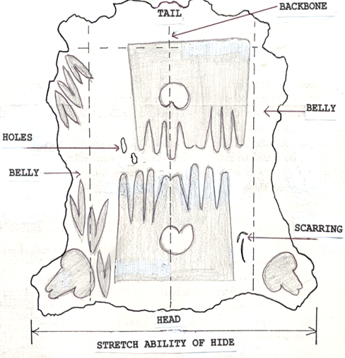 I took advantage of the stretch ability of the hide. I want to accommodate the expansion of the hand when you make a fist so I will place the pattern, so the knuckle portion of the pattern accommodates this flexibility. How to lay out a proper glove pattern: lay your trank so the fingers are pointing to either the head or the tail as illustrated in the diagram. Avoid any holes or scaring. The forchettes and thumb pattern pieces can be placed (as close together as possible to conserve leather) in the belly portion of the hide. As we stated earlier, the hide is thinnest in this portion making these pieces more flexible. Flexibility is important for these pieces because these pieces are in the part of the hand that endure the most stress when used.