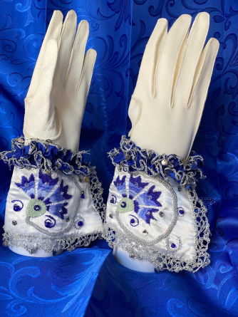 After the cuff and glove were joined, I sewed the ruched ribbon around the wrist portion and I already described how I did that, covering the seam of joining. I used silk thread for all the sewing. The bobbin lace was sewed to the cuff with metallic silver thread to enhance the decoration.